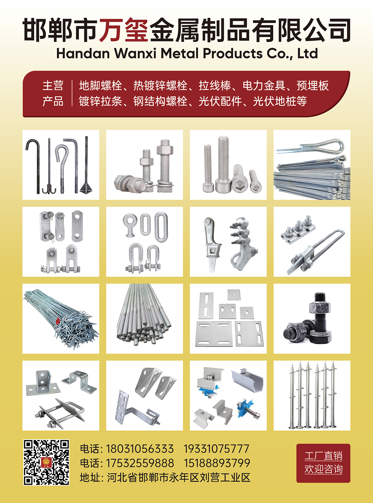 地脚螺栓、热镀锌螺栓、拉线棒、电力金具、预埋板、镀锌拉条、钢结构螺栓、光伏配件、光伏地桩等