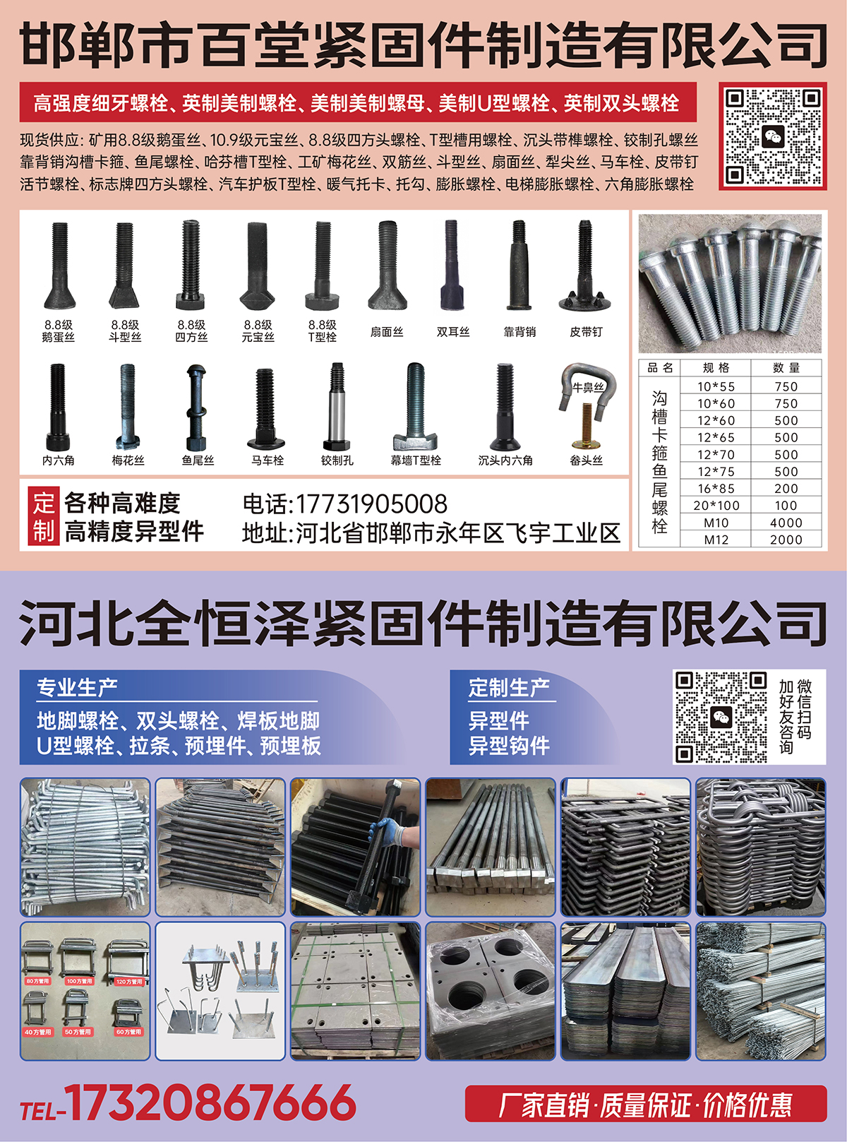 现货供应:矿用8.8级鹅蛋丝、10.9级元宝丝、8.8级四方头螺栓、T型槽用螺栓、沉头带榫螺栓、铰制孔螺丝靠背销沟槽卡箍、鱼尾螺栓、哈芬槽T型栓、工矿梅花丝、双筋丝、斗型丝、扇面丝、犁尖丝、马车栓、皮带钉活节螺栓、标志牌四方头螺栓、汽车护板T型栓、暖气托卡、托勾、膨胀螺栓、电梯膨胀螺栓、六角膨胀螺栓