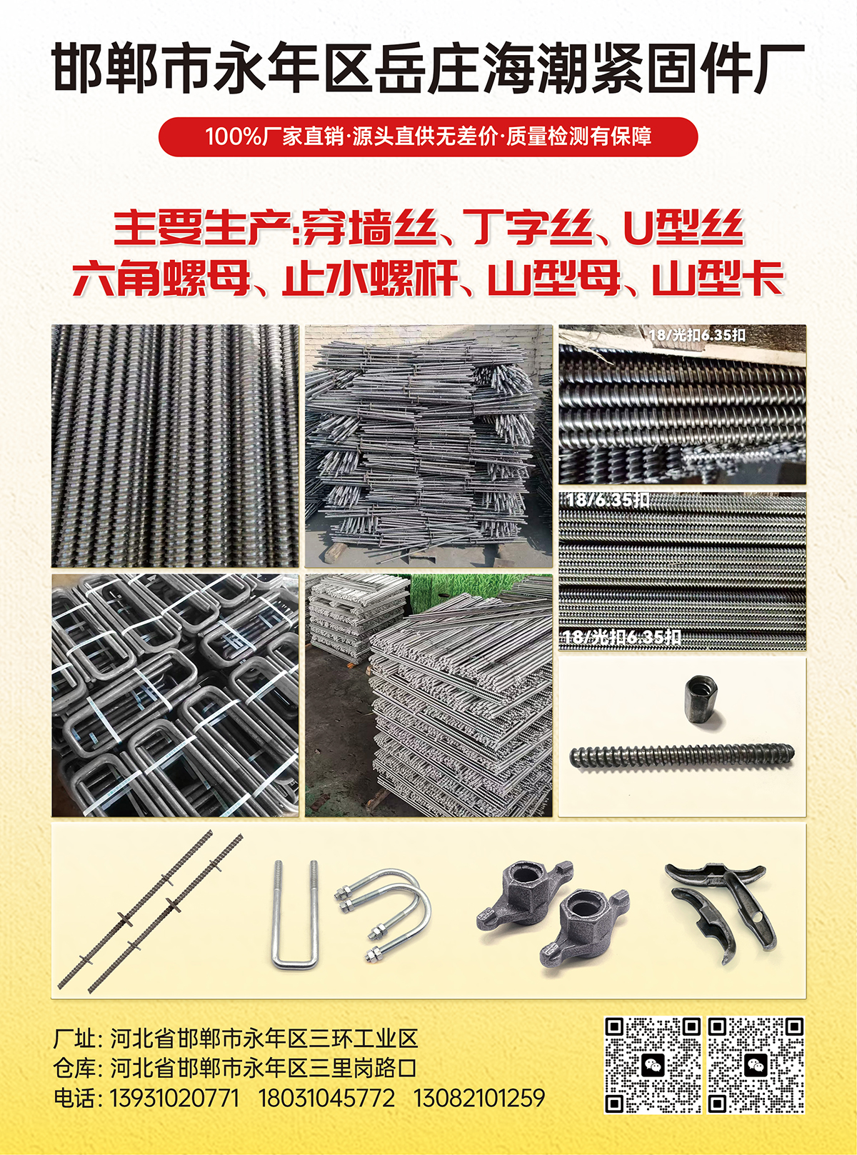 主营:现货穿墙丝、三段式止水螺杆、梯形扣、丝杠、山型件、山型母、法兰母、步步紧、模板卡勾、扣件、丁字丝、钢管接头、顶托、塑料椎体母、钢筋套筒、铁马凳楼梯护角、...