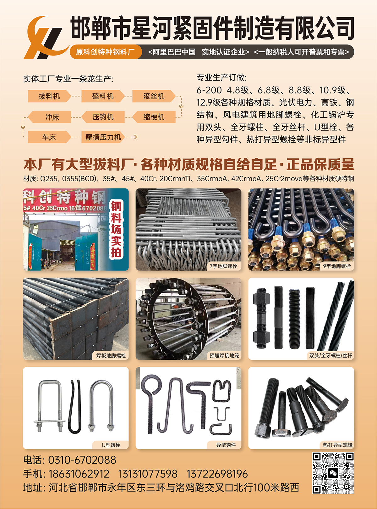 专业生产订做:6-2004.8级、6.8级、8.8级、10.9级、12.9级各种规格材质、光伏电力、高铁、钢结构、风电建筑用地脚螺栓、化工锅炉专用双头、全牙螺柱、全牙丝杆、U型栓、各种异型勾件、热打异型螺栓等非标异型件