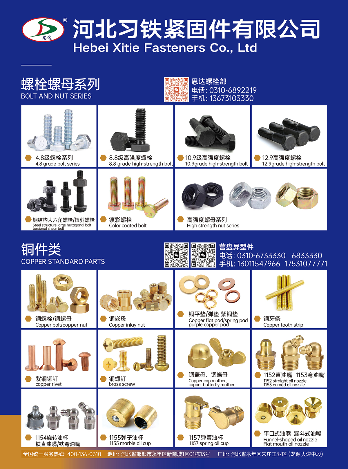 铜螺栓、铜螺母 通嵌母、铜平垫、弹垫 紫铜垫、铜牙条、紫铜铆钉、铜空心铆钉、铜螺钉、1152直油嘴 1153弯油嘴、铁直油嘴/铁弯油嘴、1154旋转油杯、1155弹子油杯、1157弹簧油杯、平口式油嘴 漏斗式油嘴
