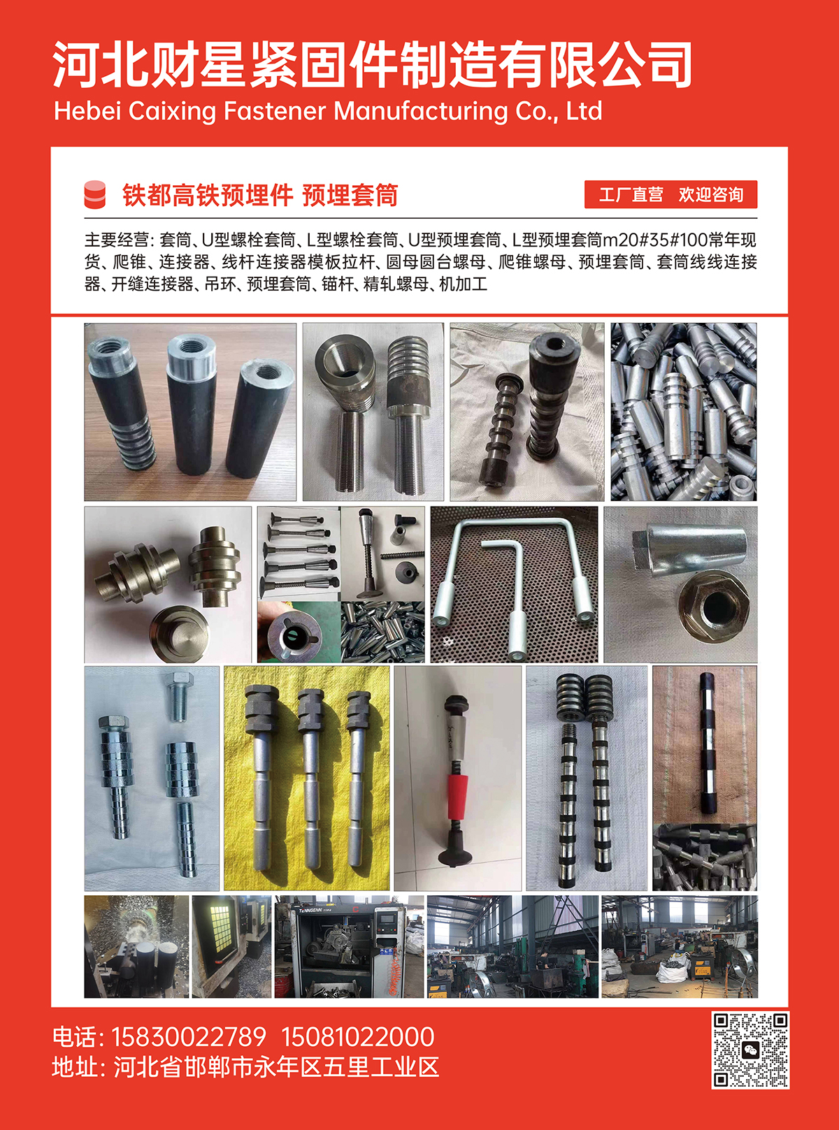 主要经营:套筒、U型螺栓套筒、L型螺栓套筒、U型预埋套筒、L型预埋套筒m20#35#100常年现货、爬锥、连接器、线杆连接器模板拉杆、圆母圆台螺母、爬锥螺母、预埋套筒、套筒线线连接器、开缝连接器、吊环、预埋套筒、锚杆、精轧螺母、机加工