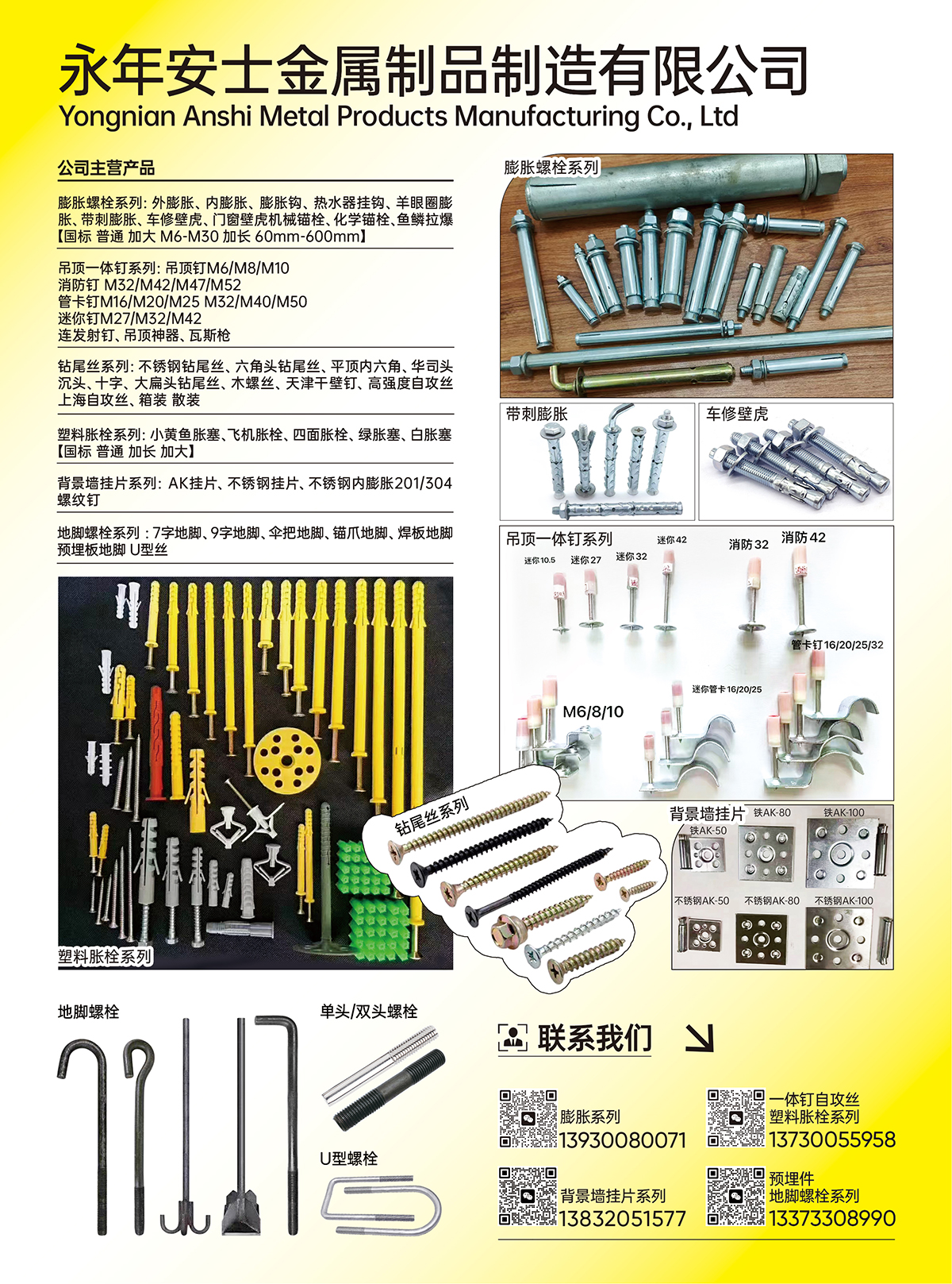 地脚螺栓系列 :7字地脚、9字地脚、伞把地脚、锚爪地脚、焊板地脚、预埋板地脚、U型丝
