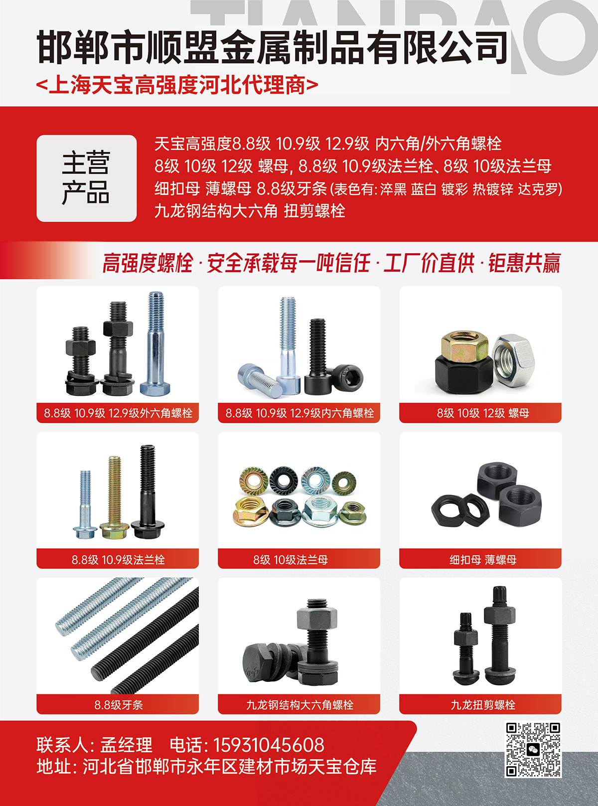 天宝高强度8.8级 10.9级 12.9级 内六角/外六角螺栓 、8级 10级 12级 螺母,8.8级 10.9级法兰栓、8级 10级法兰母 、细扣母、薄螺母、8.8级牙条 (表色有:淬黑 蓝白 镀彩 热镀锌 达克罗)、九龙钢结构大六角 扭剪螺栓