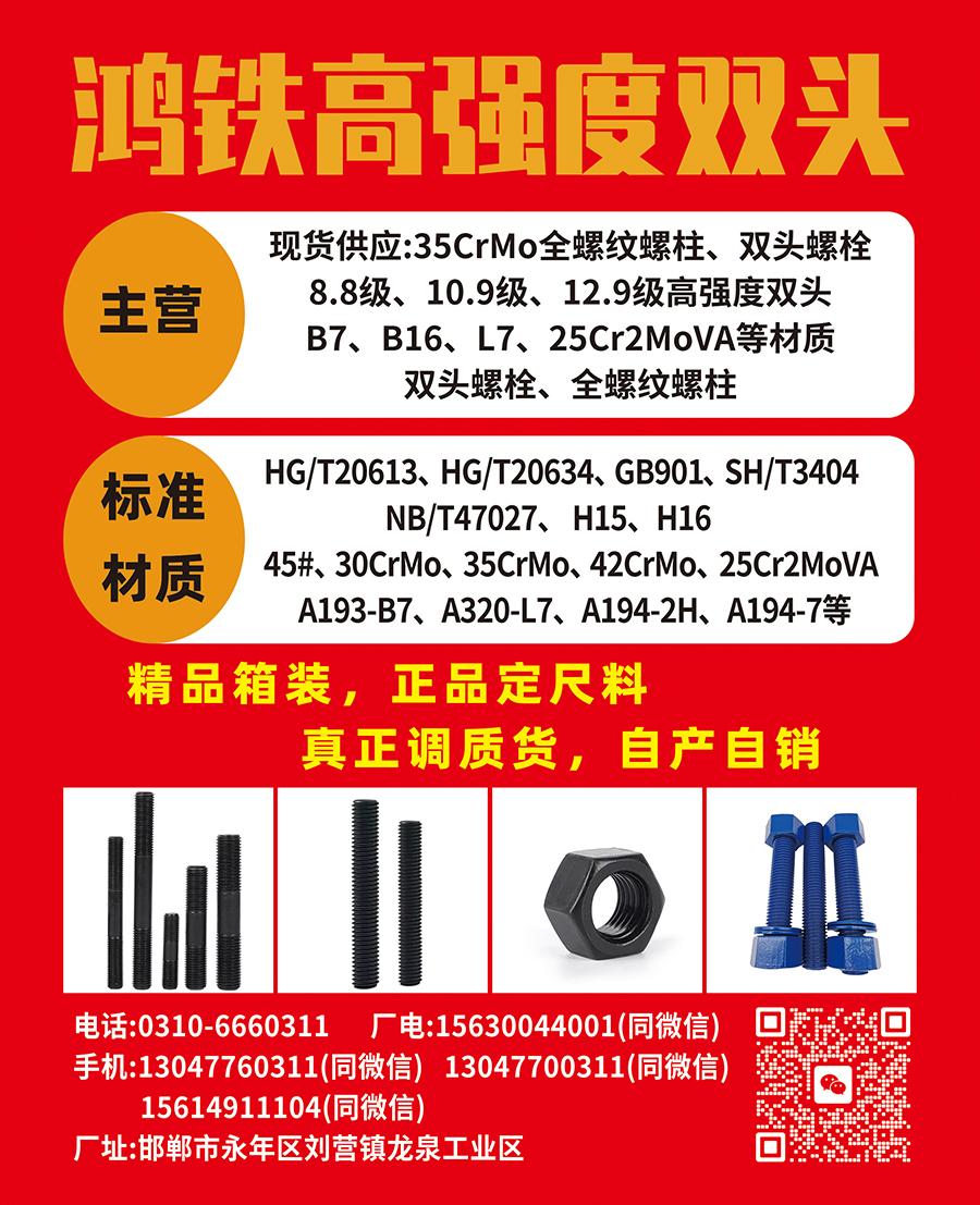 现货供应:35CrMo全螺纹螺柱、双头螺栓 8.8级、10.9级、12.9级高强度双头 B7、B16、L7、25Cr2MoVA等材质 双头螺栓、全螺纹螺柱。标准 材质: HG/T20613、HG/T20634、GB901 、SH/T3404 、 NB/T47027、 H15、H16 45#、30CrMo、35CrMo、42CrMo 、25Cr2MoVA、 A193-B7、A320-L7、A194-2H、A194-7等。精品箱装,正品定尺料。真正调质货,自产自销。