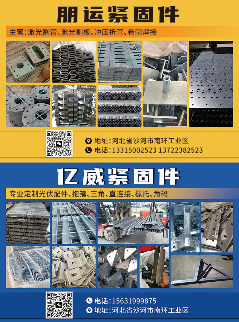 主营:激光割管、激光割板、冲压折弯、卷圆焊接。 专业定制光伏配件、抱箍、三角、直连接、檩托、角码。