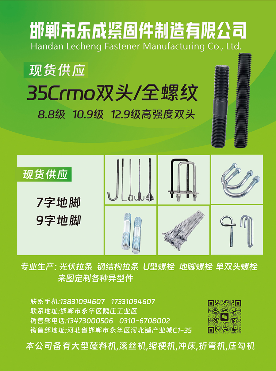 35Crmo双头/全螺纹, 8.8级 10.9级 12.9级高强度双头。7字地脚、9字地脚。专业生产:光伏拉条、钢结构拉条、U型螺栓、地脚螺栓、单双头螺栓 。来图定制各种异型件。本公司备有大型磕料机,滚丝机,缩梗机,冲床,折弯机,压勾机。