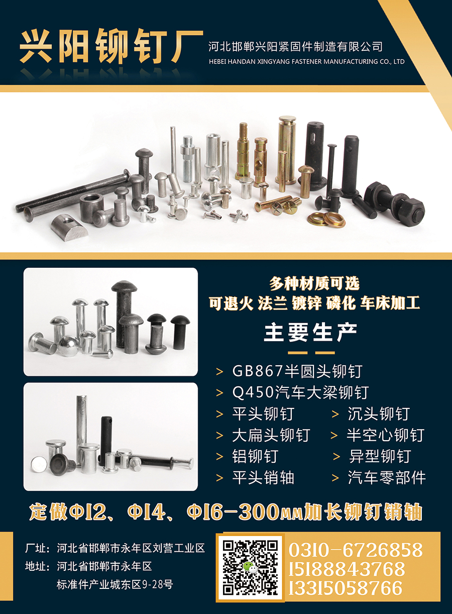 GB867半圆头铆钉、 Q450汽车大梁铆钉、平头铆钉沉头铆钉> 大扁头铆钉、半空心铆钉、铝铆钉、异型铆钉、汽车零部件。多种材质可选可退火,法兰镀锌,磷化车床加工。定做中I2、中14、中16-300Mm加长铆钉销轴。