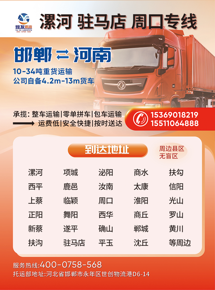 漯河、驻马店、周囗专线。邯郸--河南。承揽:整车运输|零单拼车|包车运输。运费低|安全快捷|按时送达。
